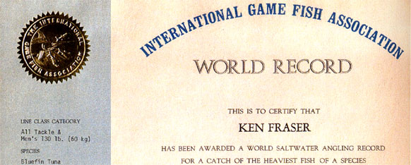 Fraser: „ Da der Drill eines Bluefins Schwerstarbeit bedeutet, hatten wir einen jungen Kerl an Bord, der den Drill der Fische übernehmen sollte. In den frühen Morgenstunden hakten wir einen guten Fisch, den wir allerdings nach ca. einer Stunde Kampf wieder verloren. Wir beköderten neu und hakten nach kurzer Zeit einen weiteren guten Fisch. Der junge Kerl, Kyte Gillis, war zu erschöpft, um den Kampf mit diesem Fisch anzutreten, somit sprang ich an dem besagten Tag in den Kampfstuhl und übernahm seinen „Job“! Eine Stunde später... unbeschreiblich... Weltrekord - 1.496 Pfund!“ “Welch Ironie; wie sich der Fang des Rekordfisches an diesem Tage zugetragen hat! Ich sollte eigentlich nicht im Kampfstuhl sitzen, meine Aufgabe war ursprünglich die Thune zu finden und bei der Landung mitzuwirken, aber nicht den Fisch zu drillen!“